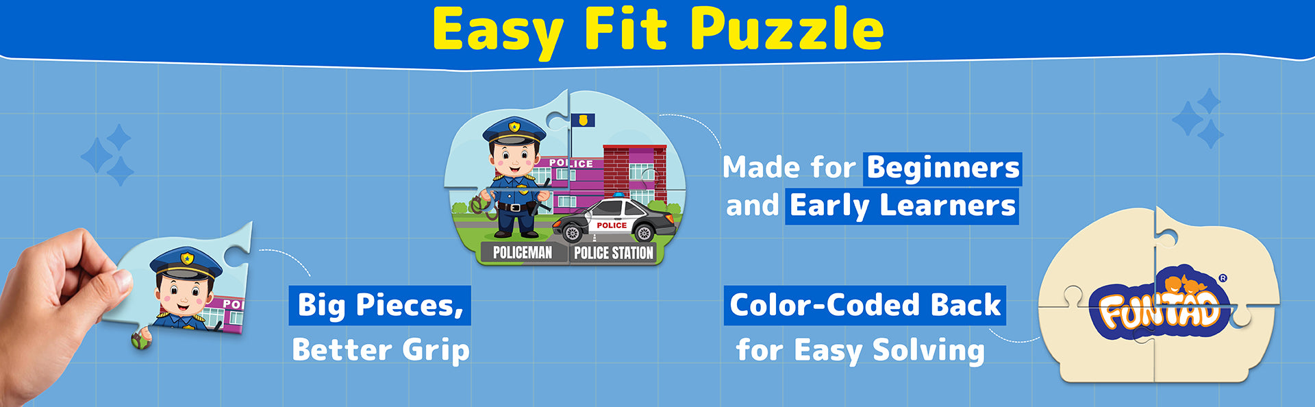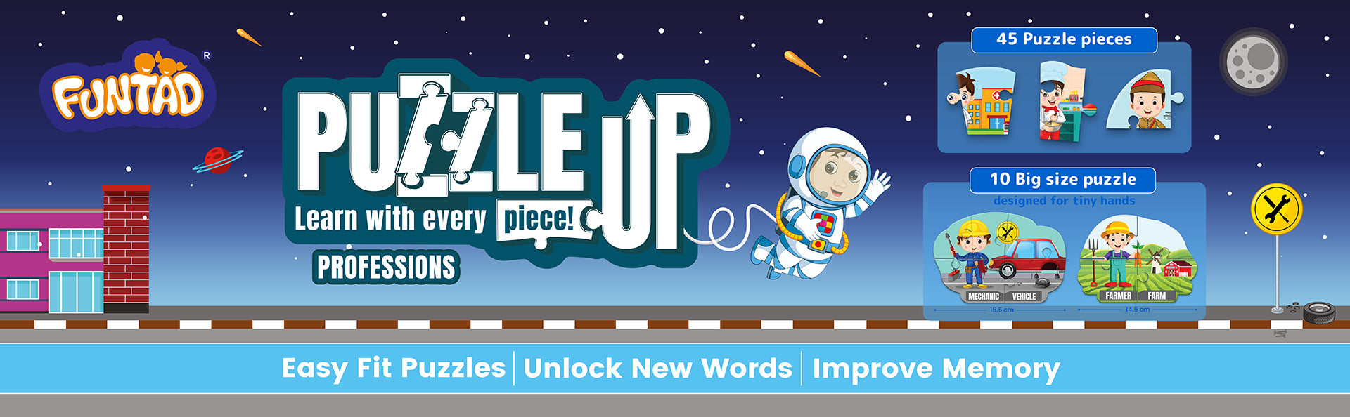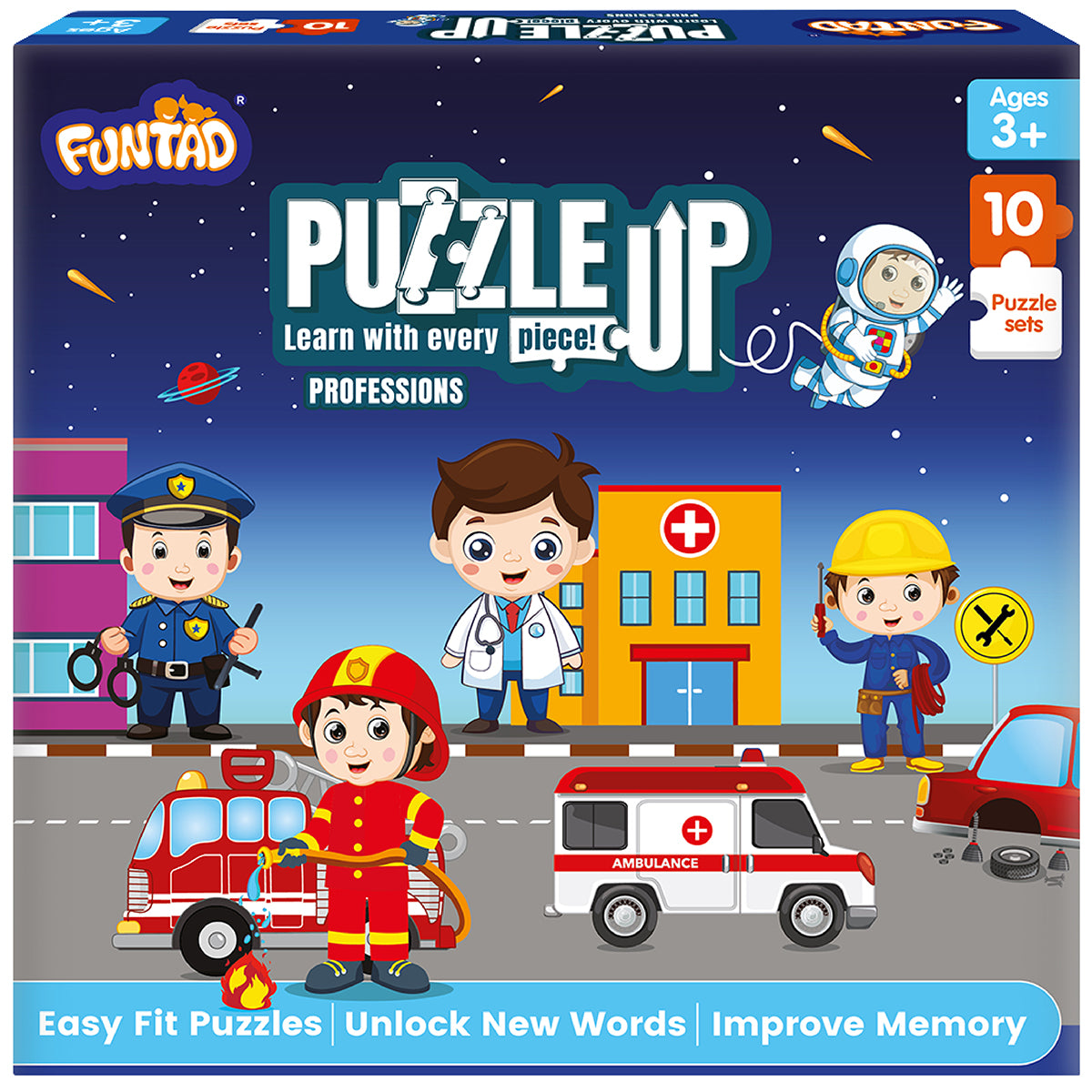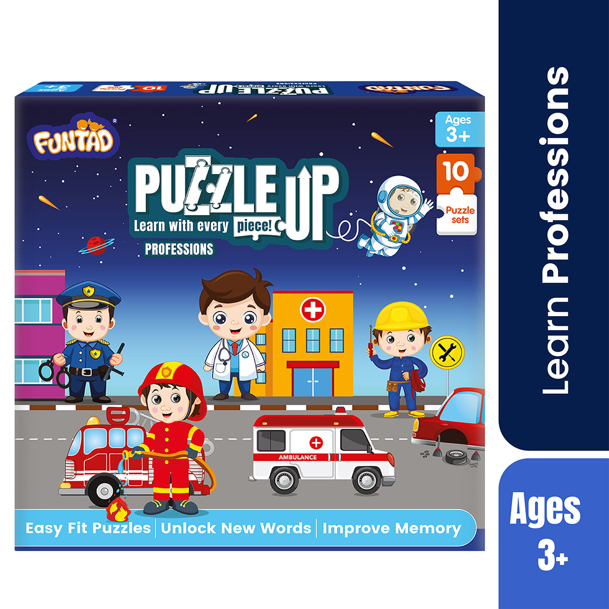 Learn with Every Piece! PuzzleUP is a fun and interactive educational entry-level puzzle game designed to discover the joy of puzzle-solving at a very young age! This puzzle showcases 10 fascinating professions that kids love, along with their related words that bring them to life. As you assemble the puzzles, you'll learn the names of each profession, related vocabulary,and their correct spellings. Join the PuzzleUP adventure and watch your child learn, grow, and thrive with every piece!
